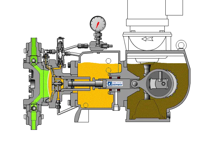 旋轉(zhuǎn)到?jīng)_程長度100%位置。這樣可以使整套部件旋轉(zhuǎn)至背板漏液排出孔與泵的最底端對(duì)齊。在泵運(yùn)行過程中調(diào)整液力端和隔膜至合適的位置。